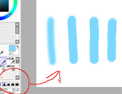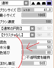 パラメータのうち上のほうにあるのはすっ飛ばして、水彩ツール独特のパラメータを試してみました。