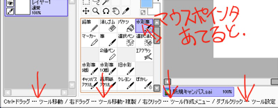 ツールアイコンにマウスポインタをあてると、一番下の灰色の部分に、説明が出てます。「右ドラッグでツール移動・複製」とか。