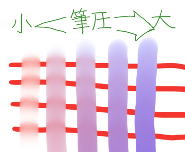 とりあえず、パラメータを動かさずにいろいろな筆圧で描いてみると、こんなかんじです。