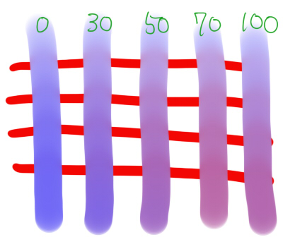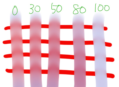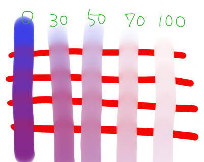 0だと、下への影響が少なく、100だと、完全に混ざった色だけになるみたいな。